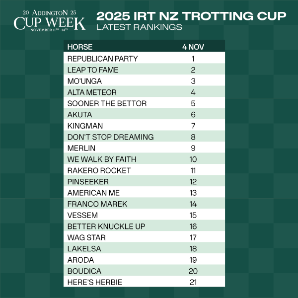 The final rankings for both the New Zealand Cup and the Renwick Farms Dominion Trot will be released following the running of the Kaikoura Cup meeting this afternoon.